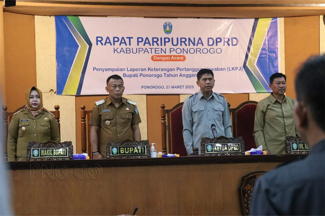 KLIKSURABAYA.CO.ID – SIDANG paripurna dengan agenda penyampaian nota penjelasan Laporan Keterangan Pertanggungjawaban (LKPj) Bupati Ponorogo Tahun 2022 berlangsung di ruang rapat utama Gedung DPRD Ponorogo, Senin (27/3/2023). Sidang dipimpin langsung oleh Ketua DPRD Ponorogo Sunarto.